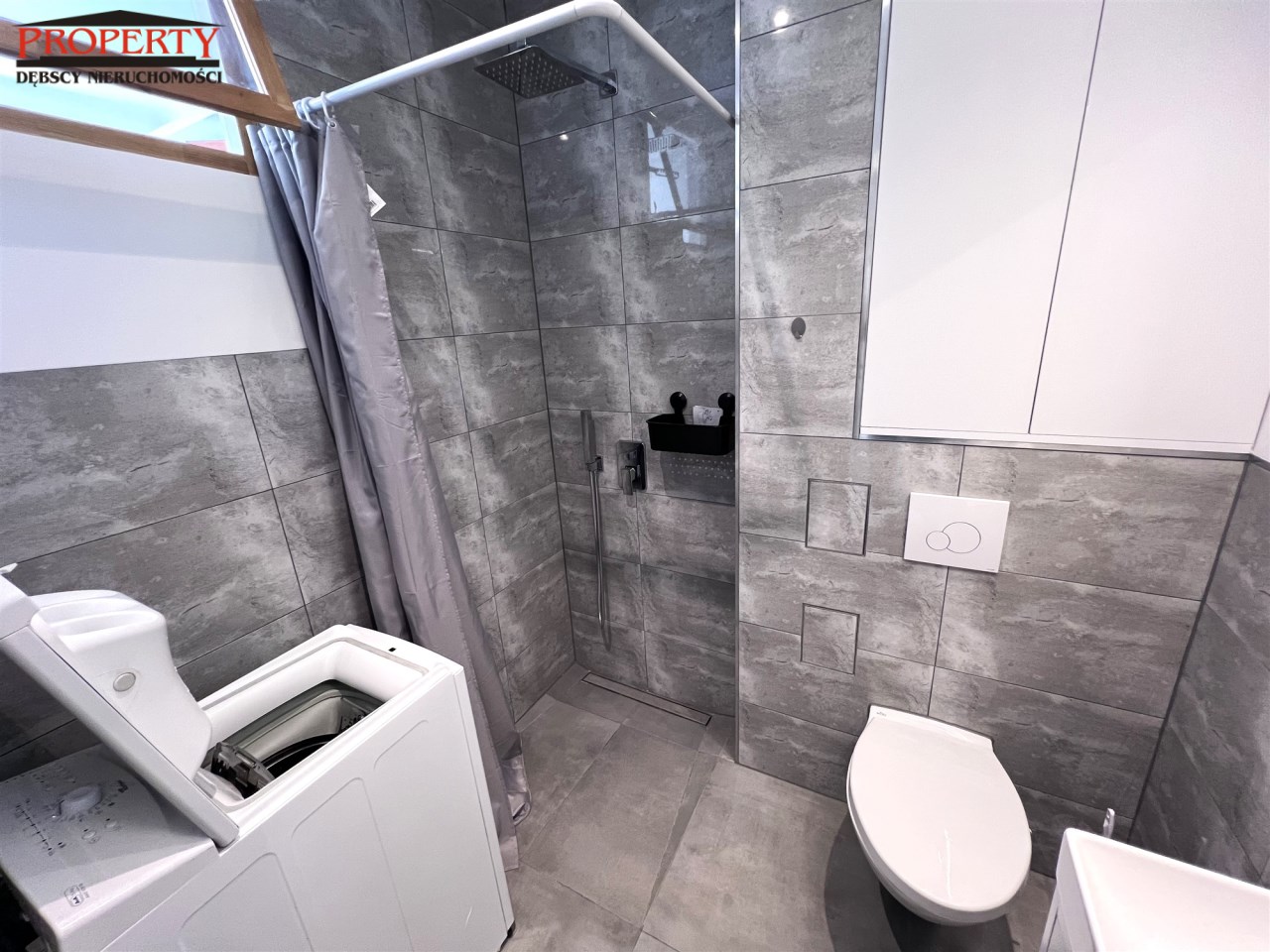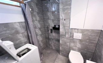 - BATHROOM: 2.5 m², shower with curtain, washbasin with cabinet, mirror, top-loading washing machine,