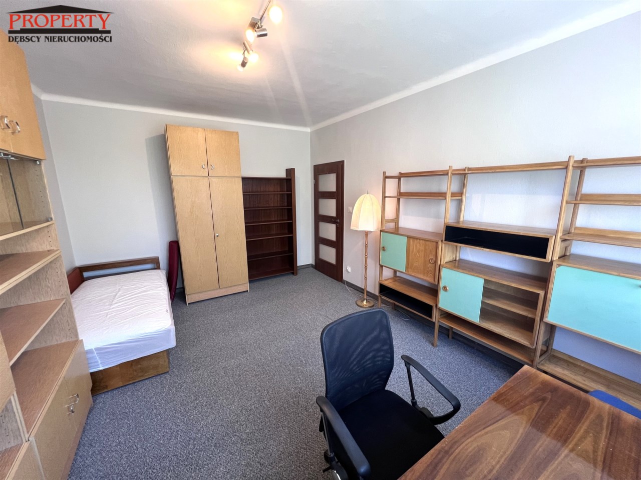 - ROOM No. 2: 18.19 m², single sofa, wardrobe with an extension, 2 smaller and larger shelves + bookcase, desk + chair on wheels and a regular chair, standing lamp,