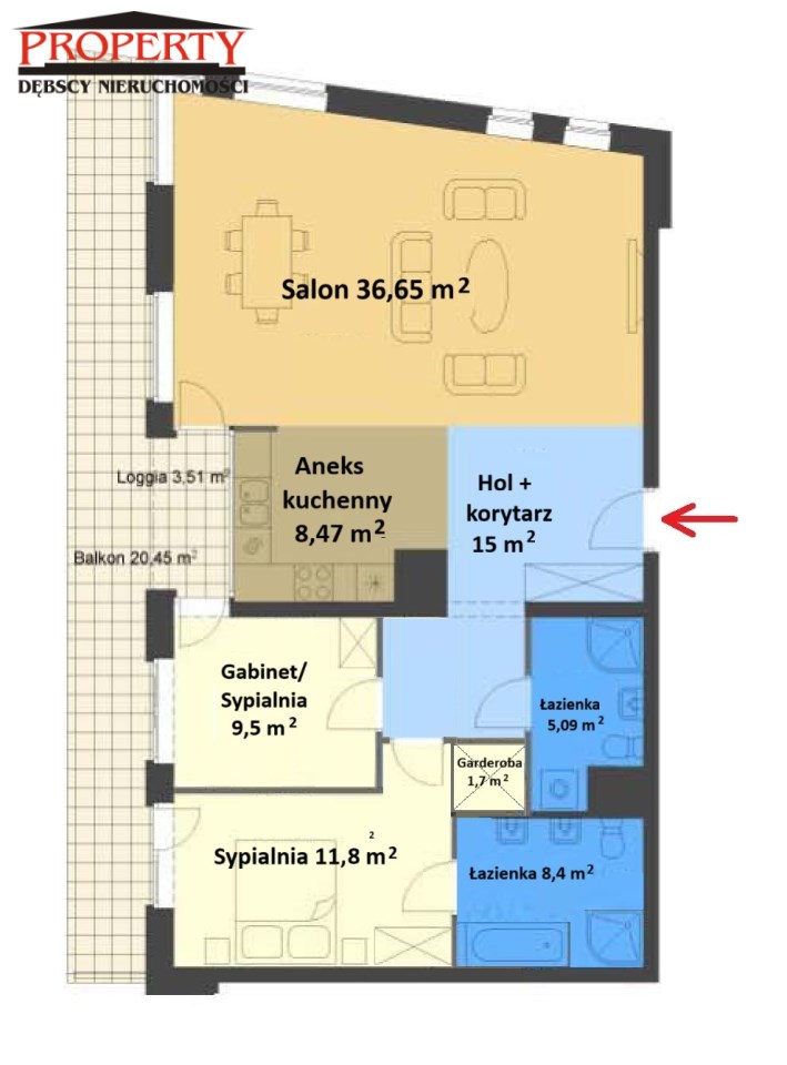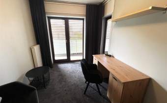 - STUDY/SECOND BEDROOM: 9.5 m² m², desk + chair, armchair + coffee table, built-in wardrobe, balcony access,