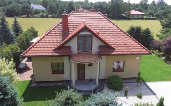 Dach pokryty jest dachówką ceramiczną w kolorze cegły.