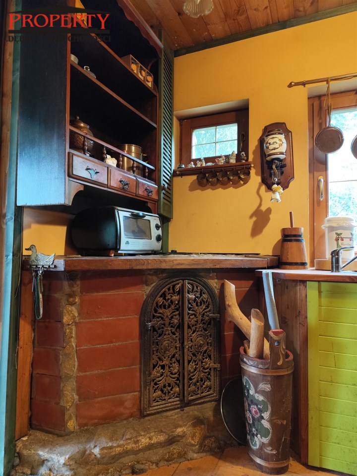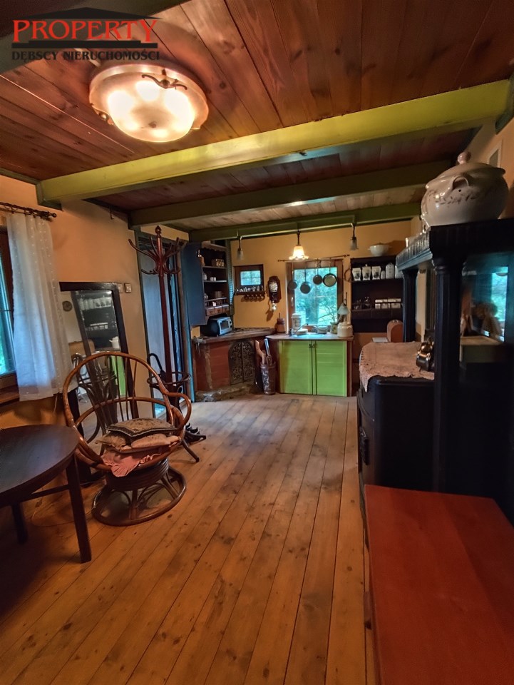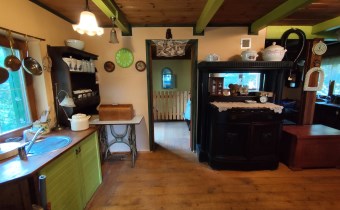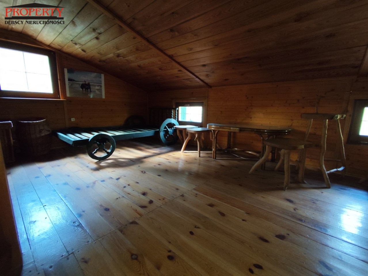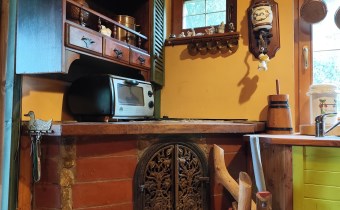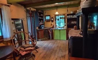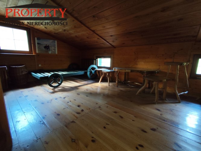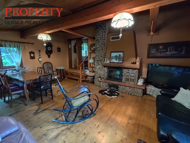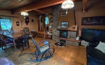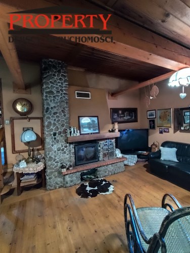 Dom posiada przestronny, klimatyczny salon z kominkiem, którego kamienna obudowa nadaje wnętrzu przytulny, góralsko-letniskowy charakter. Drewniane sufity i podłogi tworzą wyjątkowy nastrój, a liczne okna zapewniają naturalne oświetlenie oraz widok na otaczającą zieleń.