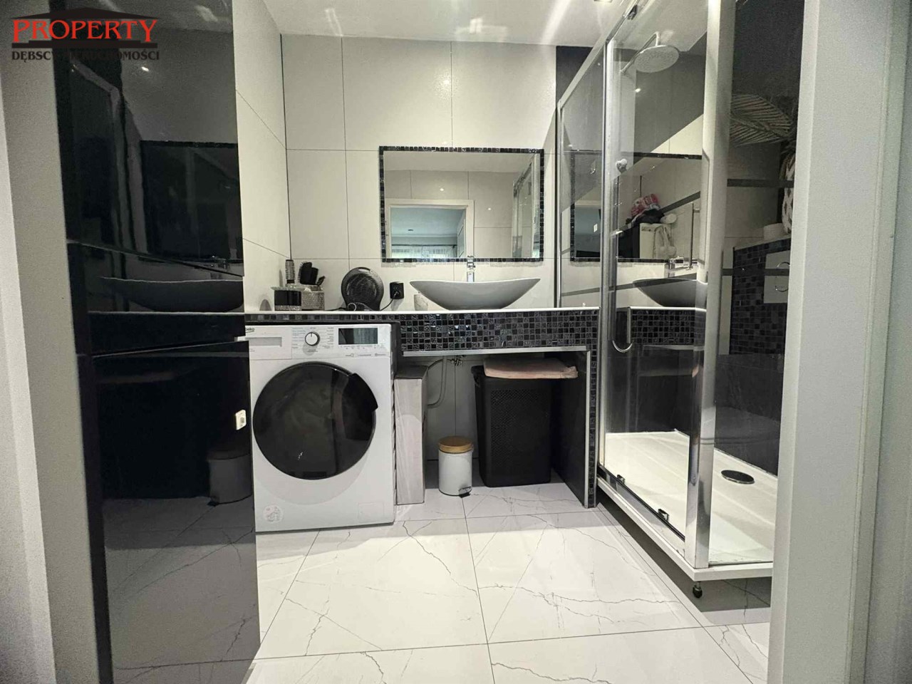 Wyposażenie łazienki kabina prysznicowa, pralka, umywalka, WC