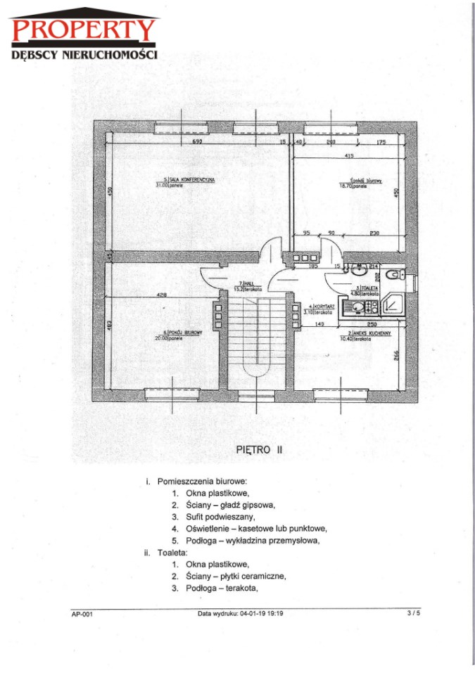 II PIĘTRO - 103,20 m : sala konferencyjna, 2 pokoje, pomieszczenie socjalne - KUCHNIA, WC z prysznicem,
