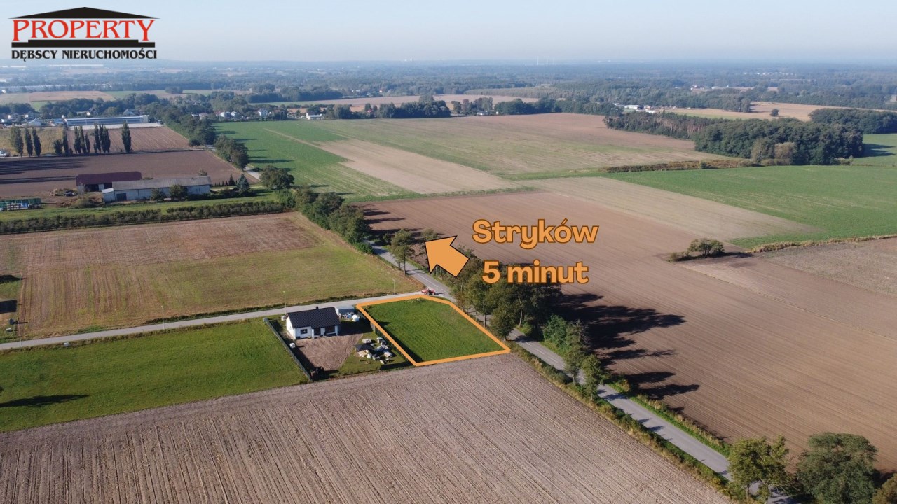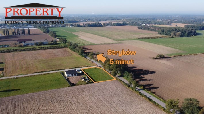Działka znajduje się bezpośrednio przy asfaltowej drodze gminnej, z jednej strony graniczy z nową zabudową jednorodzinną. Otaczają ją pola, zabudowania jednorodzinne oraz rozległe tereny zielone co zapewnia piękne widoki i walory przyrodnicze. Okolica jest cicha, idealna dla osób szukających przestrzeni i spokoju z dala od miejskiego zgiełku, jednocześnie z szybkim dojazdem do Strykowa.