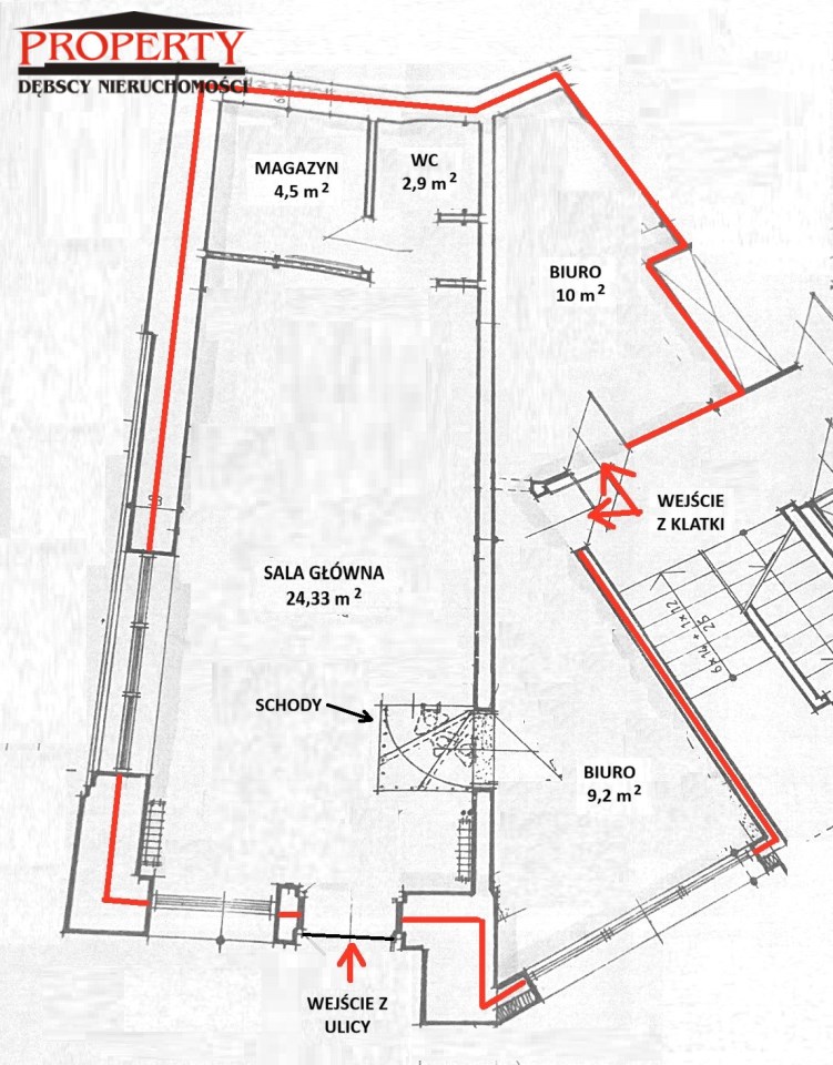 - BIURA: 2 pomieszczenia biurowe o powierzchniach 10 i 9,2 m2, wejście z sali po schodach kręconych lub z zewnątrz przez klatkę schodową wieżowca
