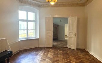 - POKÓJ FRONTOWY Z BALKONEM/SALON - opcja: 42,0 m², z balkonem od ul. Piotrkowskiej, z niego przejście przez duże podwójne drzwi do holu i do pokoju przejściowego, w pokoju ozdobny piec kaflowy, oryginalne wykończenia sufitów,