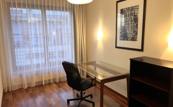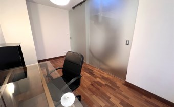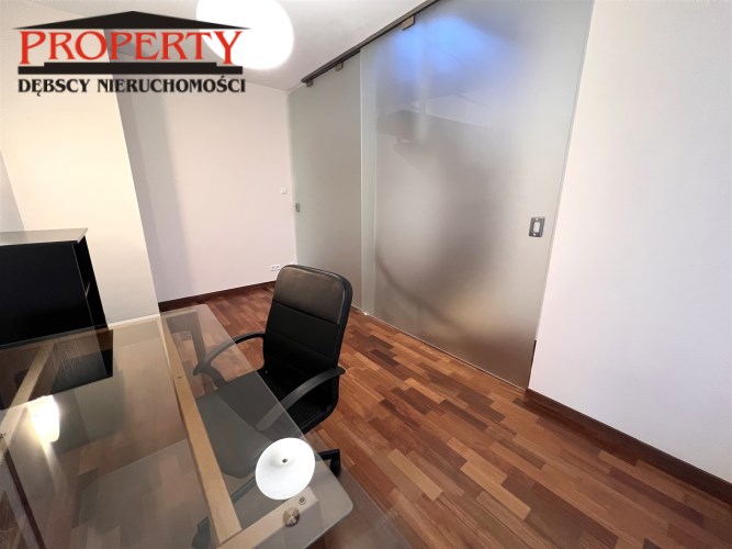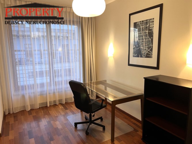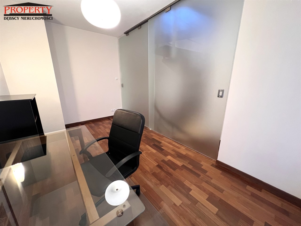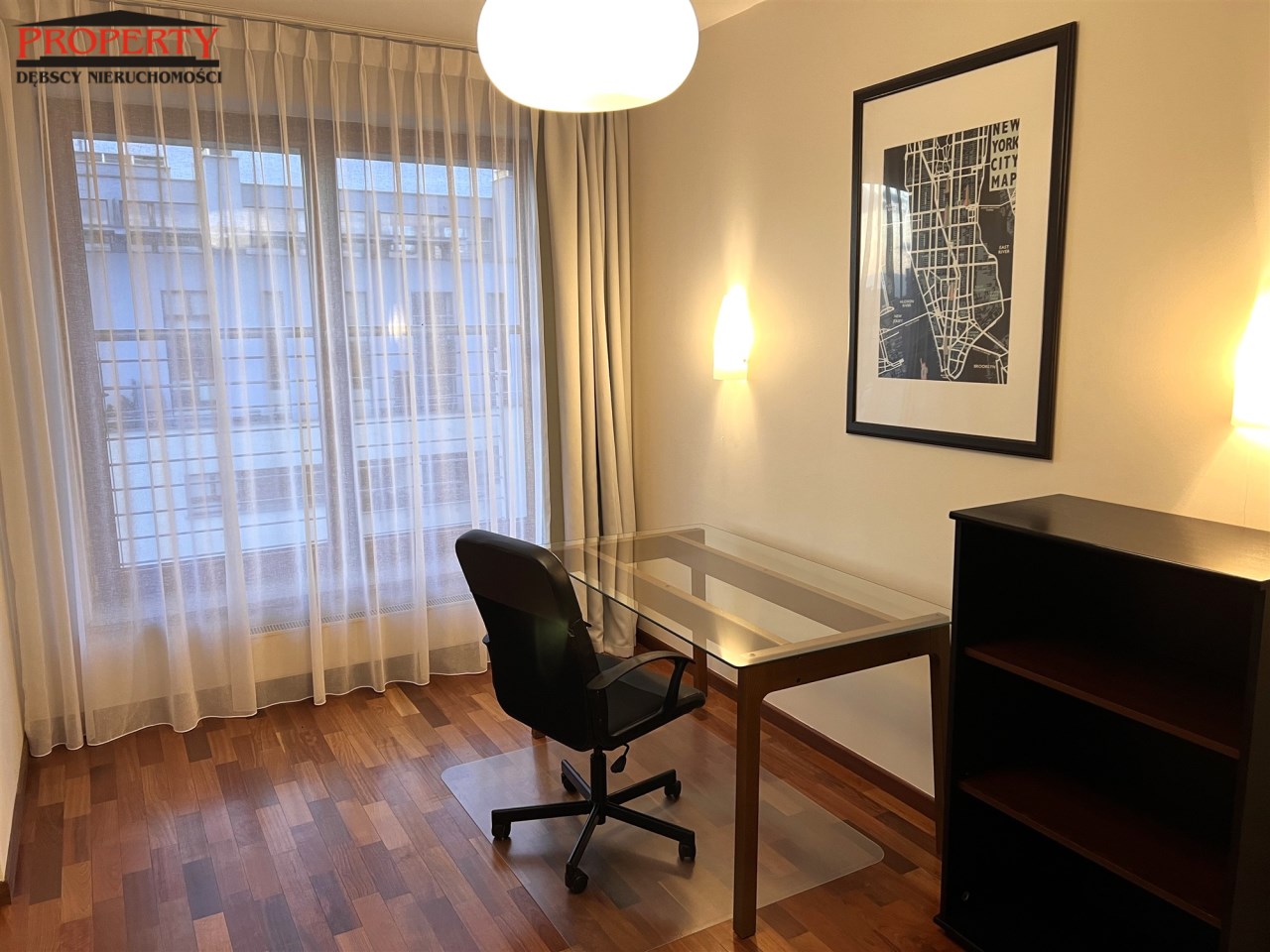 - GABINET/DRUGA SYPIALNIA: 12 m², oddzielona od reszty mieszkania szybą lakomatową, w połowie przesuwaną, obecnie pusty, tylko biurko z blatem szklanym, krzesło na kółkach, komoda z szufladami,