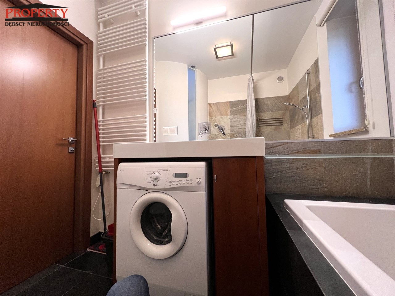 Wyposażenie łazienki kabina prysznicowa, lustro, pralka, umywalka, wanna