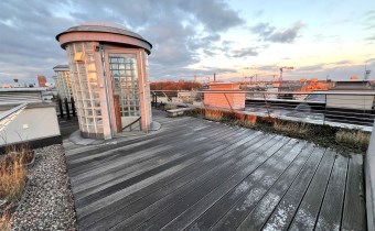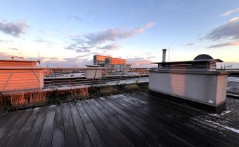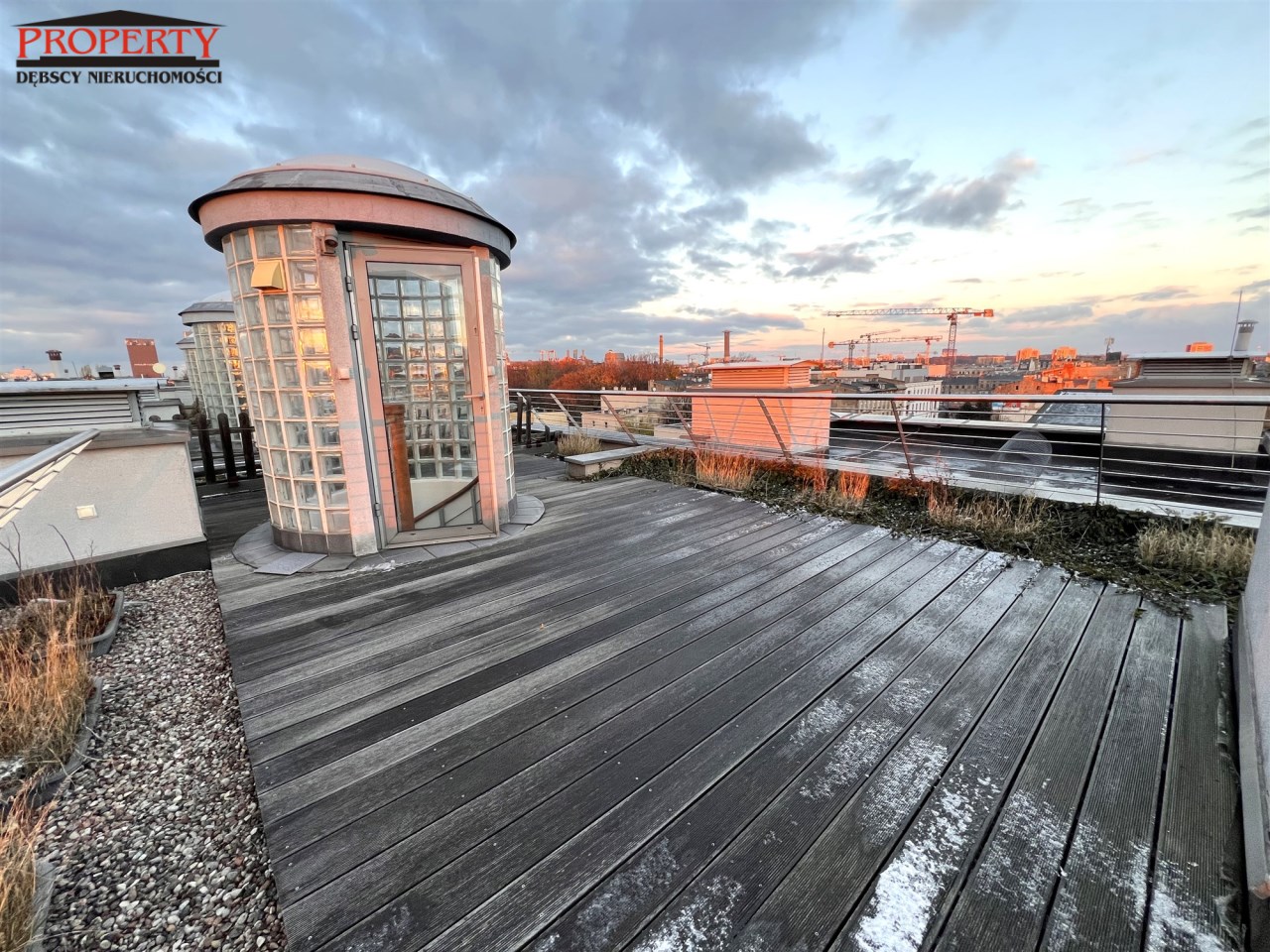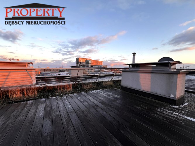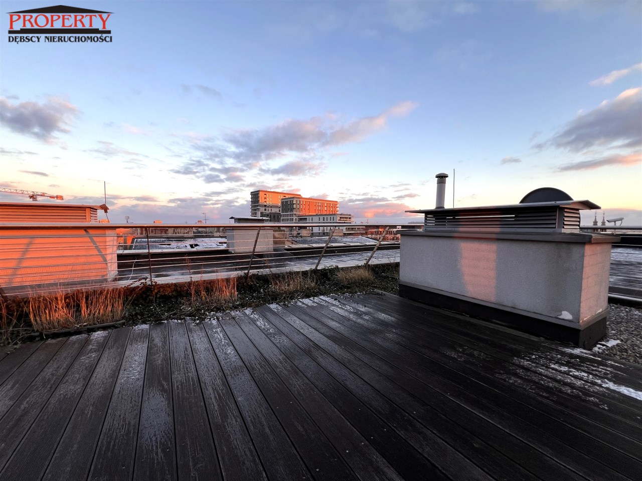 TARAS na dachu budynku, wyłożony deskami kompozytowymi, z widokiem na panoramę miasta
