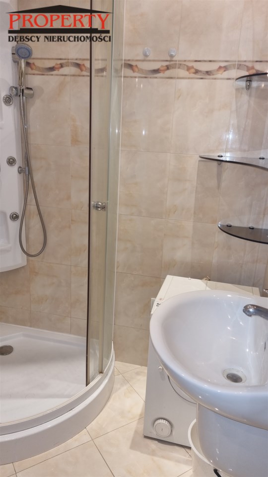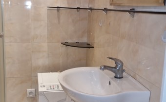 - ŁAZIENKA: ściany: glazura; podłoga: terakota; umywalka, prysznic, pralka, lustro, sedes