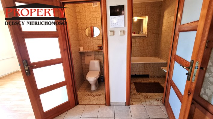 WC osobno, starsza glazura i terakota, sedes, umywalka, nowoczesne drzwi drewniane z przeszkleniami