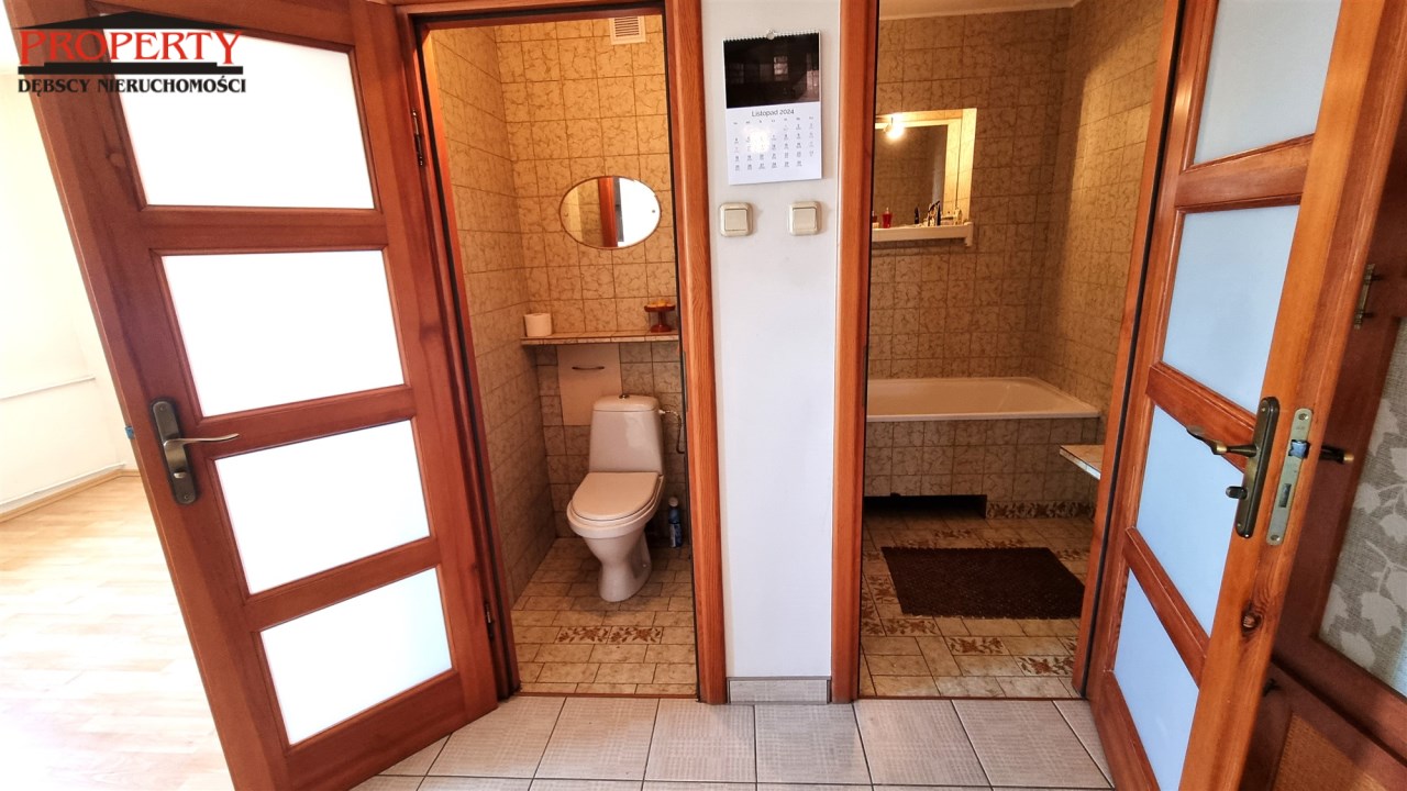 WC osobno, starsza glazura i terakota, sedes, umywalka, nowoczesne drzwi drewniane z przeszkleniami