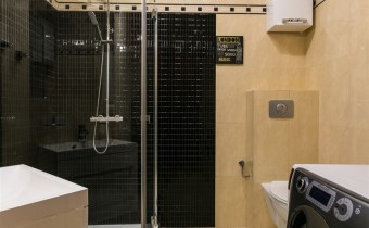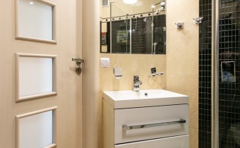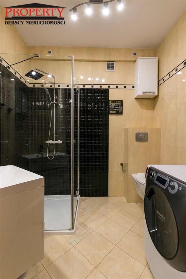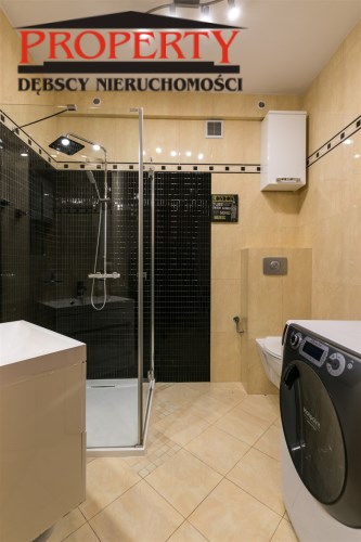 Wyposażenie łazienki kabina prysznicowa, lustro, pralka, umywalka, WC