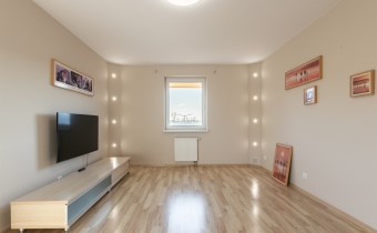 Mieszkanie zostało odmalowane w kolorach beżu, na podłogach leżą panele.