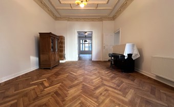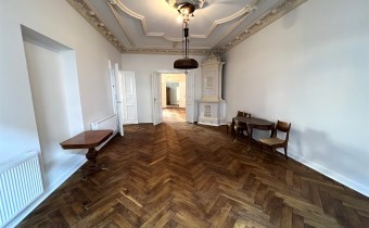 34,8 m², w pokoju ozdobny piec kaflowy, oryginalne wykończenia sufitów, okno na podwórko, z niego przejście przez duże podwójne drzwi do małego pokoju przejściowego - UWAGA: