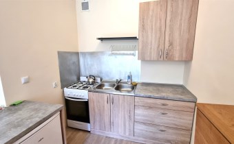- I POKÓJ: z aneksem kuchennym ok. 18 m kw, podłoga parkiet po cyklinowaniu, ściany gładzie gipsowe, malowane, kanapa, regał ,