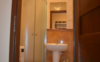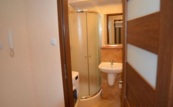- łazienka połączona z wc - w glazurze i terakocie, kabina natryskowa, podwieszane wc, umywalka z szafką, pralka
