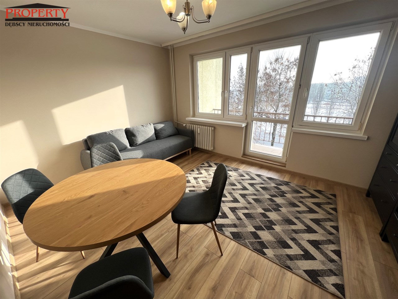 - DUŻY POKÓJ Z BALKONEM: 16,1 m², duża rozkładana kanapa, stół + 4 krzesła, zestaw - szafka RTV + witryna,dywanik, wyjście na balkon,
