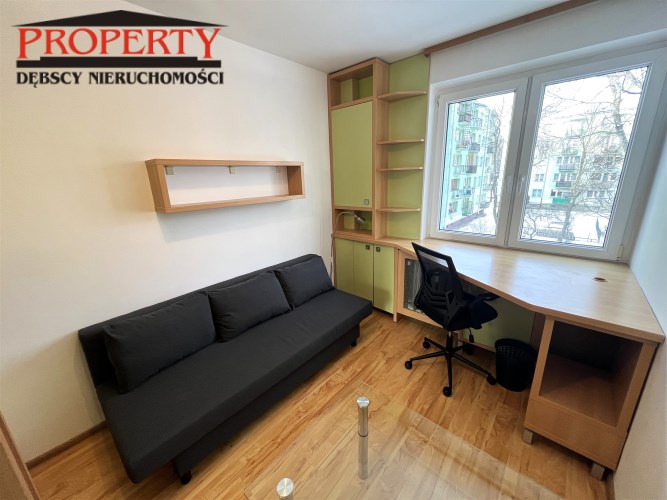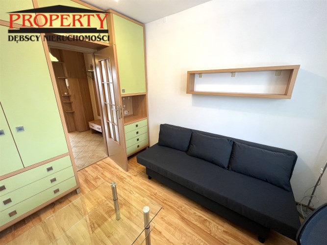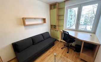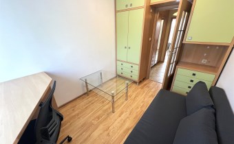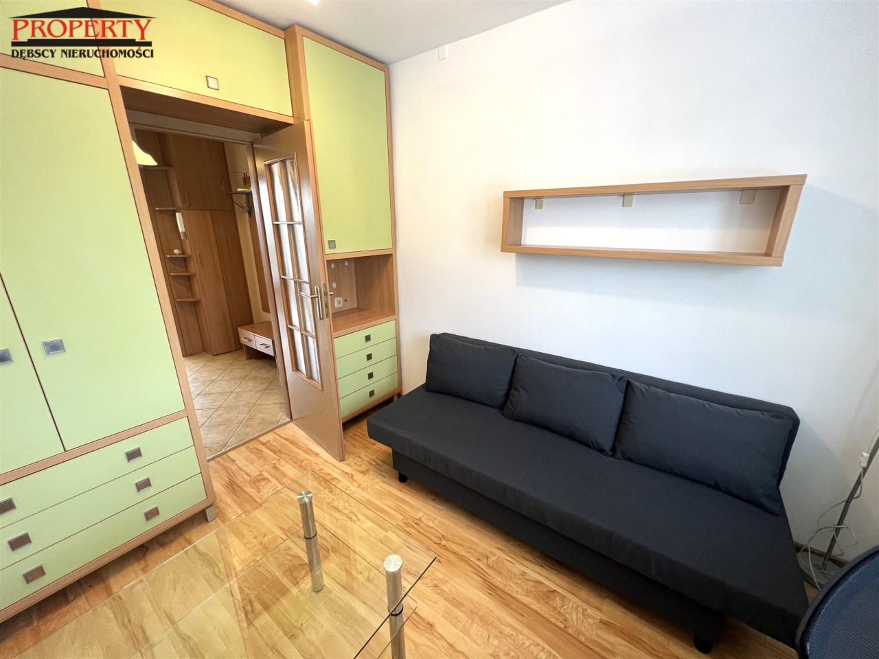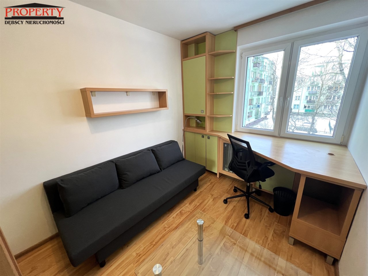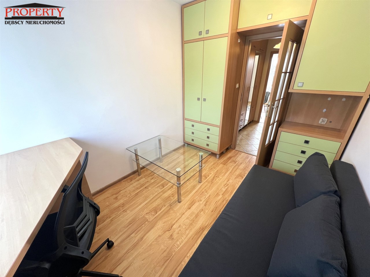 - MAŁY POKÓJ: 8,85 m², rozkładana kanapa, biurko narożne + krzesło, zestaw meblowy z szafą i regałem, ława szklana - do ewentualnego przestawienia do dużego pokoju,