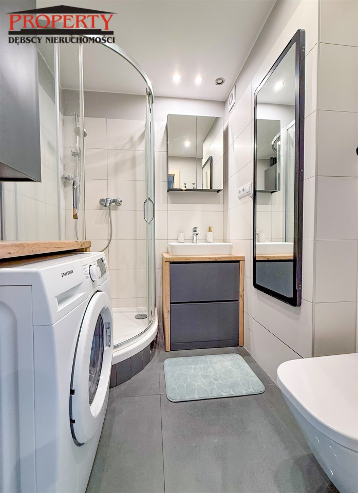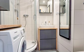 Wyposażenie łazienki WC, umywalka, prysznic, pralka, lustro, kabina prysznicowa