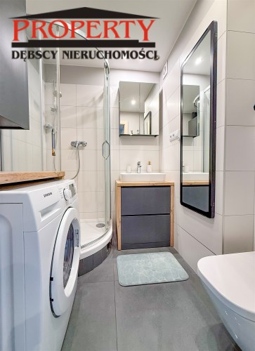 Łazienka w nowoczesnych barwach z dużą kabiną prysznicową, dodatkowo wyposażona w pralkę.