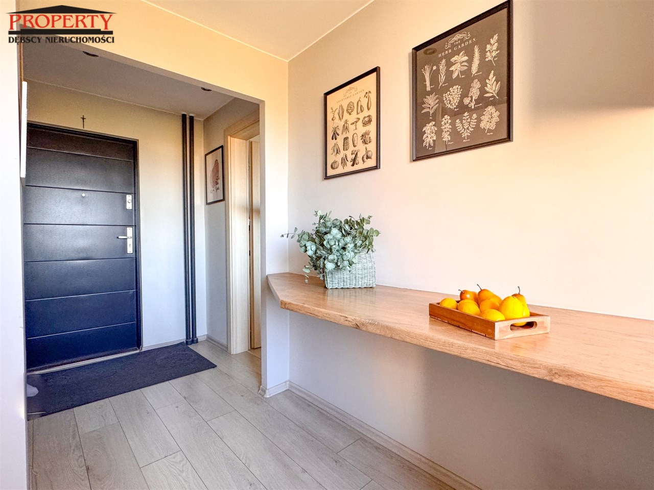 Duży przedpokój z zabudowaną szafą porządkuje przestrzeń.