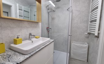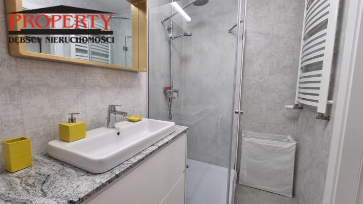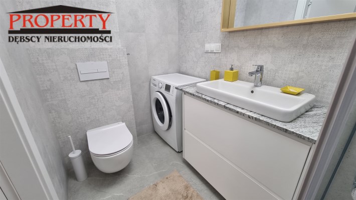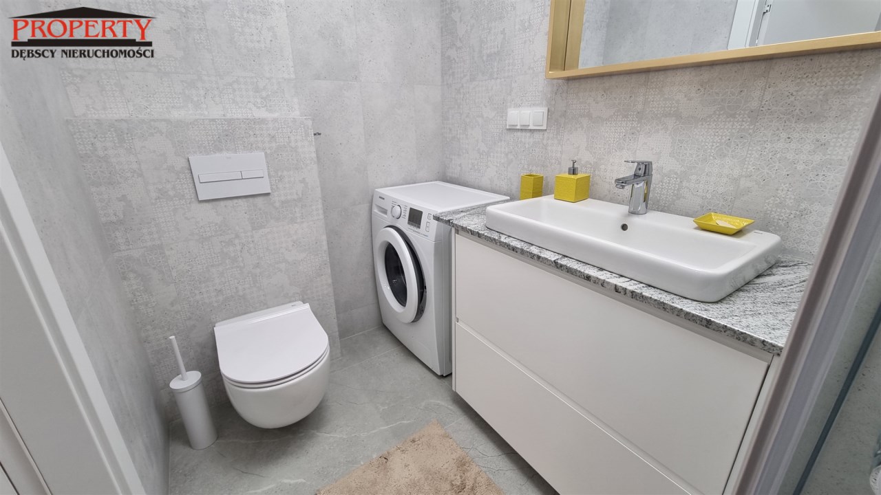 - ŁAZIENKA z WC: kabina prysznicowa, pralka, sedes podwieszany, umywalka z szafką, lustro.