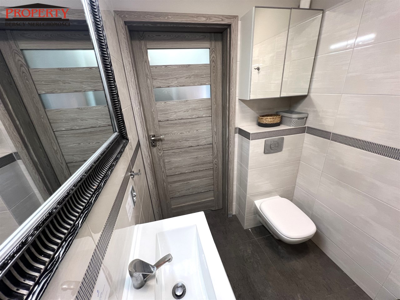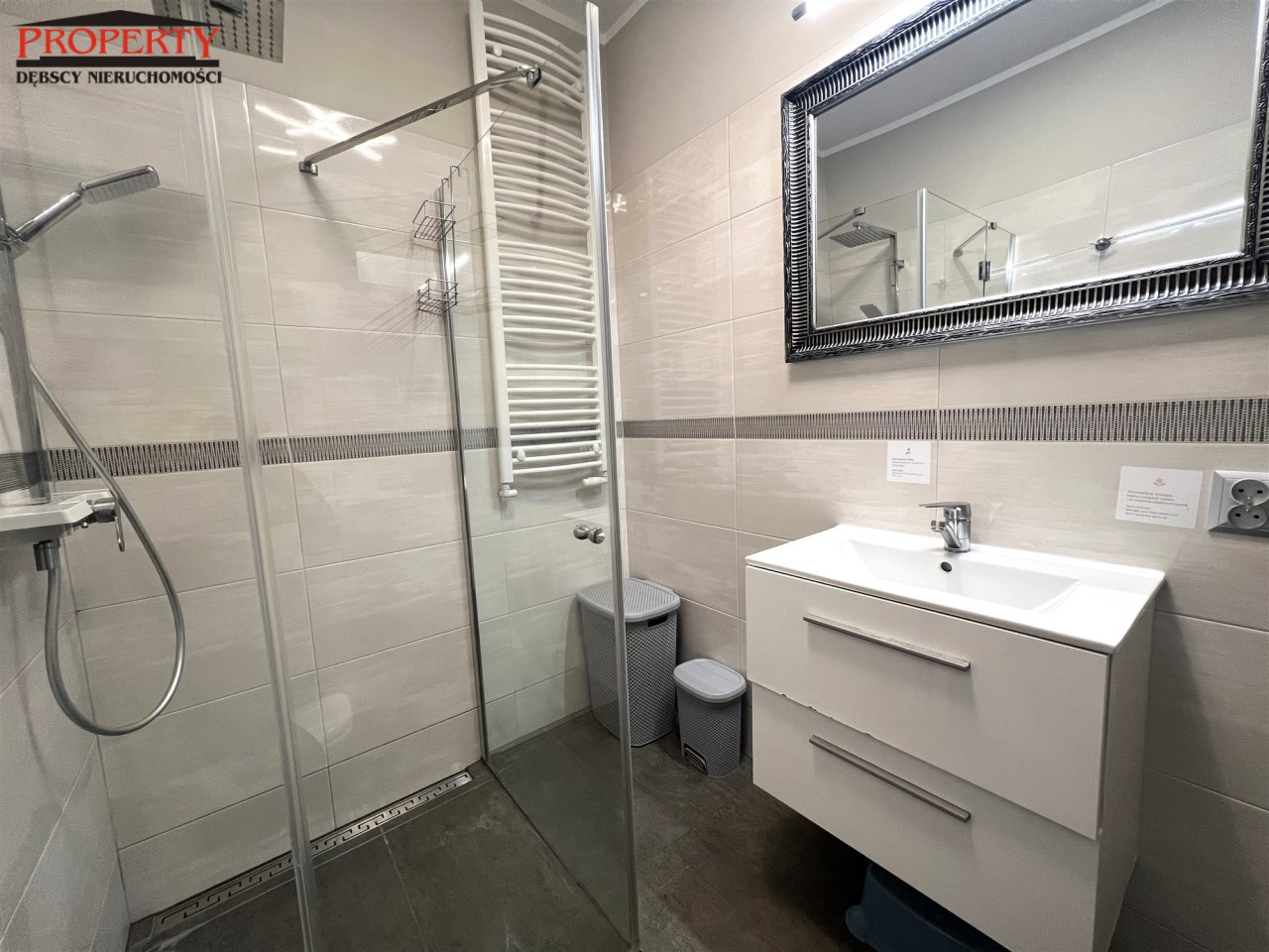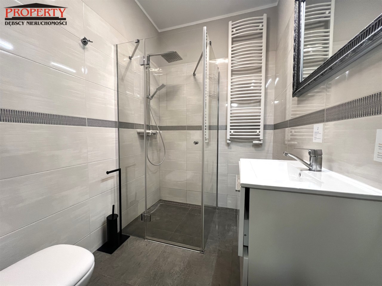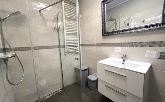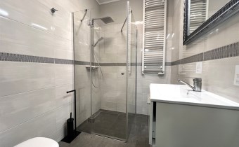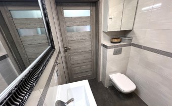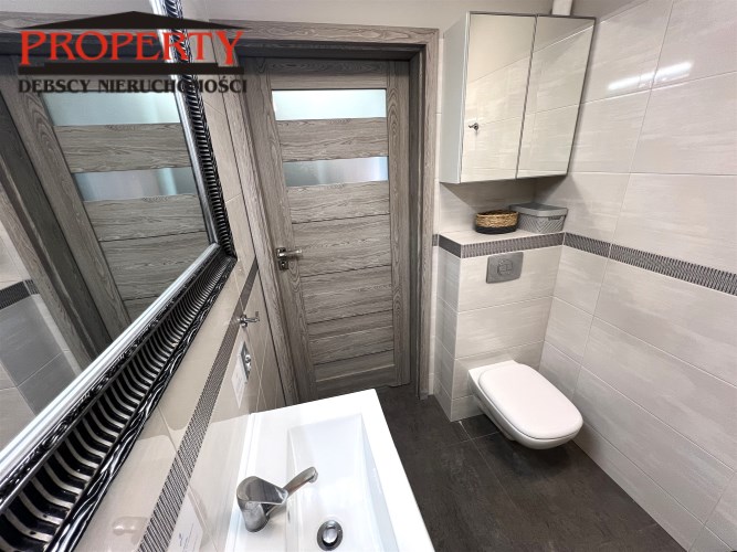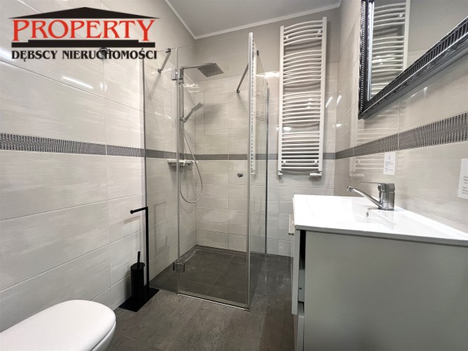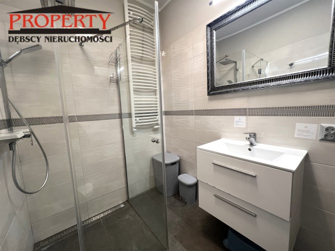 ŁAZIENKA z WC: kabina prysznicowa,umywalka z szafką, lustro wiszące z oświetleniem, sedes podwieszany, kosz na śmieci, szafka wisząca z lustrem,