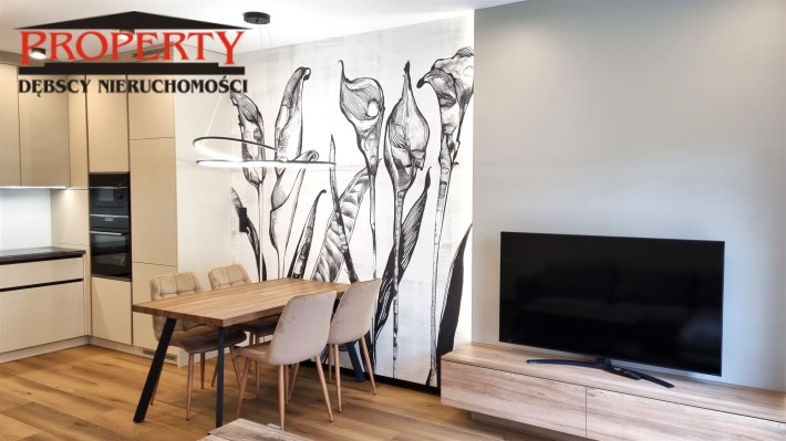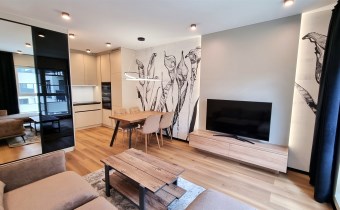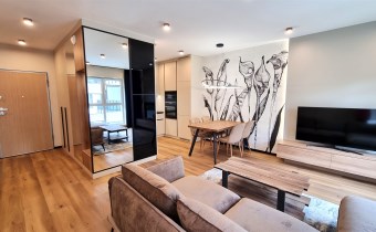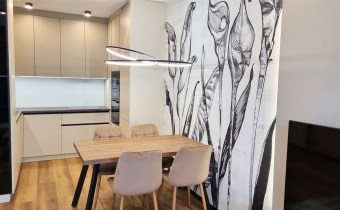- POKÓJ DZIENNY/SALON połączony z aneksem kuchennym : kanapa narożna, stolik kawowy, szafka RTV , telewizor, stół + 4 krzesła, dywan, zasłony, roletki - plisy okienne, ściany gładzie gipsowe i ozdobna tapeta, podłoga eleganckie panele, klimatyzacja