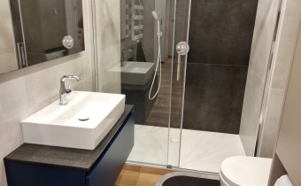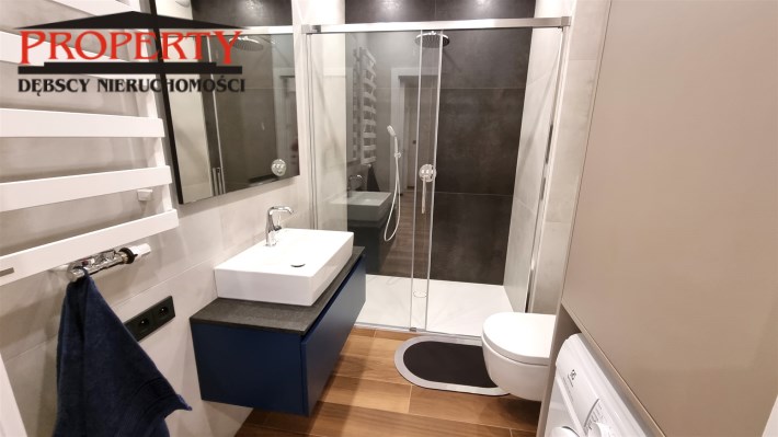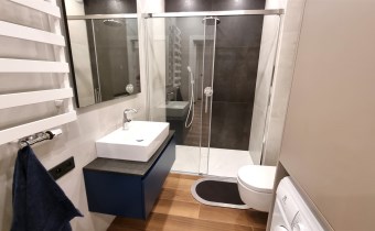 - ŁAZIENKA z WC: kabina prysznicowa, szafa łazienkowa w zabudowie z pralką, sedes podwieszany, umywalka z szafką, lustro