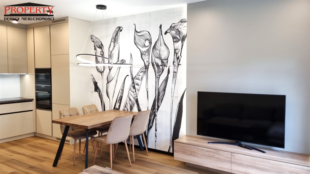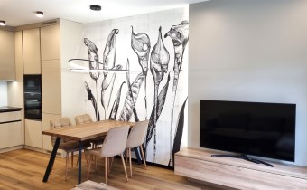 - POKÓJ DZIENNY/SALON połączony z aneksem kuchennym : kanapa narożna, stolik kawowy, szafka RTV , telewizor, stół + 4 krzesła, dywan, zasłony, roletki - plisy okienne, ściany gładzie gipsowe i ozdobna tapeta, podłoga eleganckie panele, klimatyzacja