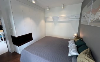 - SYPIALNIA: 7,8 m², łóżko małżeńskie + 2 szafki/półki nocne, duża szafa garderoba w zabudowie, dywanik,