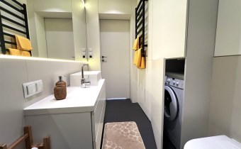 - ŁAZIENKA Z WC: 7,8 m², umywalka z szafką łazienkową z lustrem, kabina prysznicowa, WC, pralka w zabudowie,