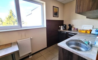 - Zaplecze SOCJALNE - kuchnia - podłoga terakota, meble kuchenne ze zlewozmywakiem, lodówką, zmywarką